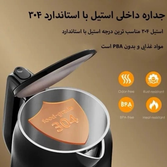 -جنس: PP+SUS304/T -حجم: 1.7 لیتر -قدرت: 220V-240V/50Hz 1500W -ترموستات: KSD568D+KSD568K -جوش سریع 1800 وات آب جوشیده را سریع بنوشید: Smart Kettle View قادر به جوشاندن آب با 1800 وات است که می تواند آب را در چند دقیقه بجوشد و در نتیجه زمان انتظار شما را کوتاه کند. -1.7 لیتر ظرفیت بزرگ نیازهای آب آشامیدنی کل روز را برآورده کنید: SmartKettle View می تواند حدود 8.5 فنجان آب (1 فنجان آب ≈ 200 میلی لیتر) را در هر بار بجوشاند، که برای نوشیدن یک نفر برای یک روز کامل کافی است. -استیل 304 درجه مواد غذایی آب گرم سالم و بدون بو بنوشید: نمای داخلی Smart Kettle View از فولاد ضد زنگ درجه مواد غذایی 304 ساخته شده است که بدون BPA، بدون بو، مقاوم در برابر حرارت و مقاوم در برابر زنگ زدگی است. بنابراین آب ایمن تر است و تمیز کردن آن راحت تر است. -استیل 304 درجه مواد غذایی آب گرم سالم و بدون بو بنوشید: نمای داخلی Smart Kettle View از فولاد ضد زنگ درجه مواد غذایی 304 ساخته شده است که بدون BPA، بدون بو، مقاوم در برابر حرارت و مقاوم در برابر زنگ زدگی است. بنابراین آب ایمن تر است و تمیز کردن آن راحت تر است. -سنج سطح آب شفاف مانیتور آسان و به موقع حجم آب: سطح سنج امکان نظارت آسان و به موقع بر حجم آب را فراهم می کند، که نه تنها امکان اضافه کردن به موقع آب را فراهم می کند، بلکه از گرم کردن آب بیشتر از نیاز شما و خطر آب بیش از حد در هنگام جوشیدن جلوگیری می کند. -خاموش شدن خودکار آب را در هر زمان با خیال راحت بجوشانید: هنگامی که آب به جوش می آید، Smart Kettle View به طور خودکار خاموش می شود تا از سوختن خشک و ایجاد آتش جلوگیری شود. -درب دکمه ای ایمن تر برای استفاده: طراحی درب دکمه ای آن آزاد شدن ملایم بخار را تضمین می کند و پاشیدن آب را از بین می برد و از سوختن شما جلوگیری می کند.