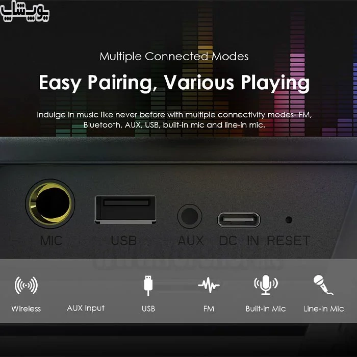 نوع اتصال: بی سیم _ توان خروجی کلی: 30 وات _ نوع: قابل حمل _ رابط اتصال: بلوتوث, USB, جک 3.5 میلی متری _ ورژن بلوتوث: v5.0 _ برد: 10 متر _ فرکانس پاسخ گویی: 85 هرتز تا 16 کیلوهرتز _ سایر امکانات: پشتیبانی از تکنولوژی TWS Pairing دارای جلوه های نورپردازی LED چهار حالته RGB دارای استاندارد IPX5 جهت مقاومت در برابر آب دارای باس سنگین و کوبنده _ ورودی میکروفن: YES _ رادیو: YES _ ظرفیت: 3,600 میلیآمپر _ مدت زمان شارژدهی: تا 6 ساعت (با نورپردازی روشن) تا 7 ساعت (با نورپردازی خاموش) -اندازه: طول: 36.00 سانتیمتر عرض: 13.30 سانتیمتر ضخامت: 13.20 سانتیمتر