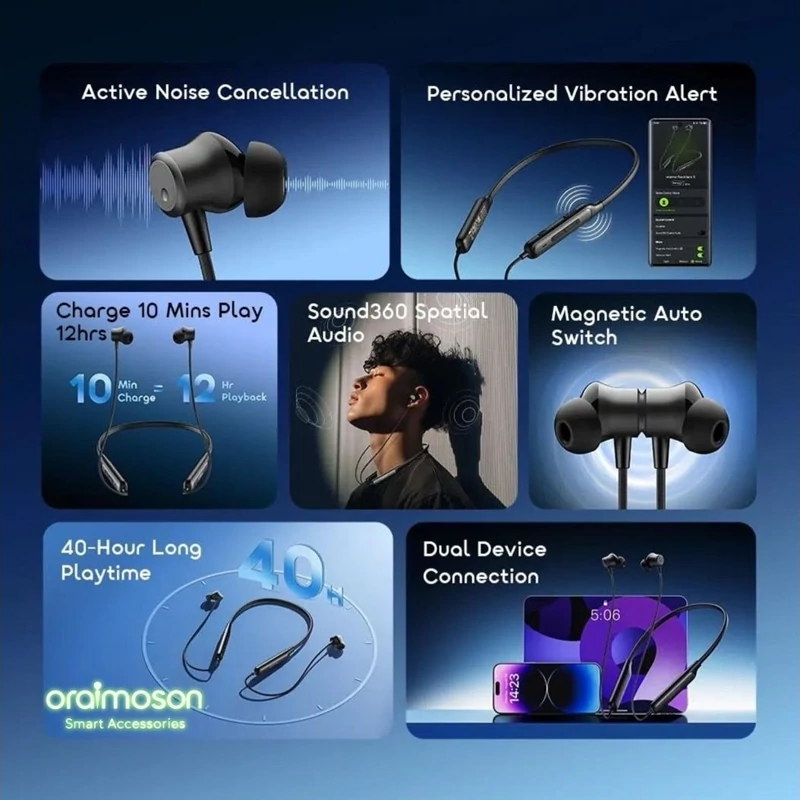 -مزایای کلیدی اورایمو Necklace 5 راحتی بالا برای استفاده طولانیمدت کیفیت صدای فراگیر با Sound360 مکالمه شفاف با ANC قوی اتصال همزمان به دو دستگاه باتری طولانی و شارژ سریع ویبره شخصیسازیشده طراحی مدرن و گردنی برای استفاده آسان در هر موقعیت اپلیکیشن و امکانات نرمافزاری